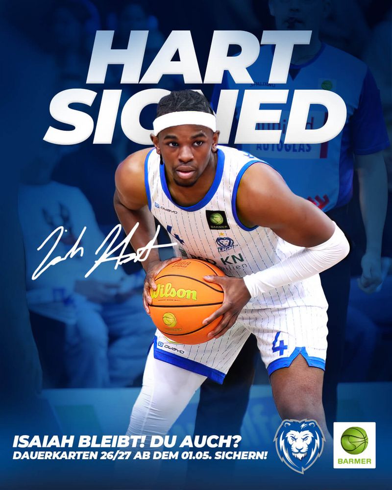 Wer Isaiah Hart auch in der kommenden Spielzeit im LIONS-Trikot erleben will, hat ab dem 1. Mai die Gelegenheit: Sichert euch eure Dauerkarte für die Saison 2026/27! Alle aktuellen Dauerkarteninhaber können sogar ihre Plätze ab morgen verlängern und bleiben damit Teil des Karlsrudels.